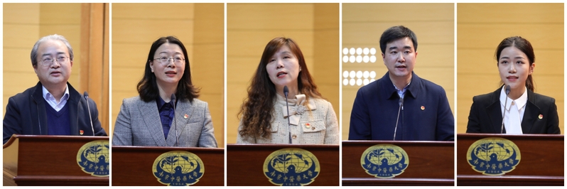 会议主题交流环节,药学院党委书记曹凯、中西医结合学院党总支书记蒋燕、马克思主义学院·医学人文学院党总支书记张艳萍、团委书记史文川、医学院2019级临床医学本科生王纤易等五位师生代表从宣传思想文化工作的不同侧面,分别以《构建“三全育人”新格局,提升铸魂育人实效》《以“明艳精神”点亮奋进之光》《深刻领会“两个结合”,推进习近平新时代中国特色社会主义思想融入思政教育教学》《如萤火、似火焰,聚生辉、散燎原——农民健康百村工程17年生动实践》《让青春在思政实践中闪光》为题作交流发言。