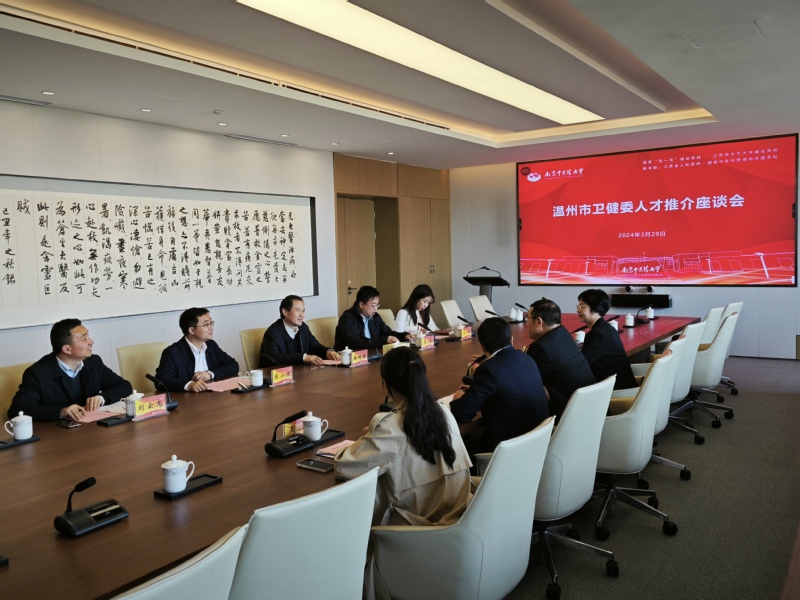 3月29日下午,温州市卫生健康委员会人才推介座谈会在我校在仙林校区行政楼316会议室举行。温州市卫生健康委员会副书记、副主任陈继忠,温州市中西医结合医院院长姜文兵,温州市中医院副书记、副院长甘桦,我校党委常委、副校长徐树法,党委研究生工作部、学生工作处负责人出席座谈会。座谈会由学生工作处处长陈小进主持。