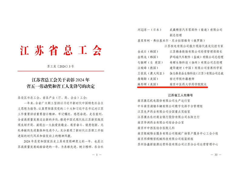五一劳动节来临之际,江苏省总工会发布了《关于表彰2024年省五一劳动奖和省工人先锋号的决定》(苏工发〔2024〕3号),南京中医药大学麻彤辉教授荣获“江苏省五一劳动荣誉奖章”。