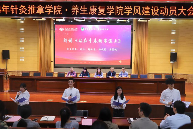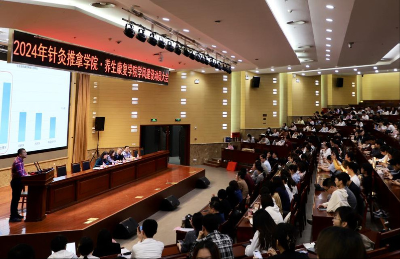 为全面贯彻落实立德树人根本任务,聚焦“双一流”建设,进一步优化育人环境,培育优良学风,营造良好的学习氛围,持续推动学风建设工作走深走实,全面提升人才培养质量, 4月23日下午,针灸推拿学院•养生康复学院在丰盛楼报告厅召开2024年学风建设动员大会。学院党委书记王珏,学院副院长(主持行政工作)吴云川,学院党委副书记、副院长刘明,学院副院长王欣君,学院副院长卞尧尧,全体学业指导教师、学工办辅导员、学生代表参加大会。大会由学生工作办公室主任杜巍主持。