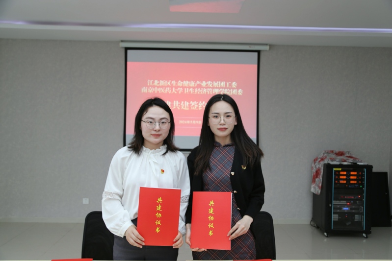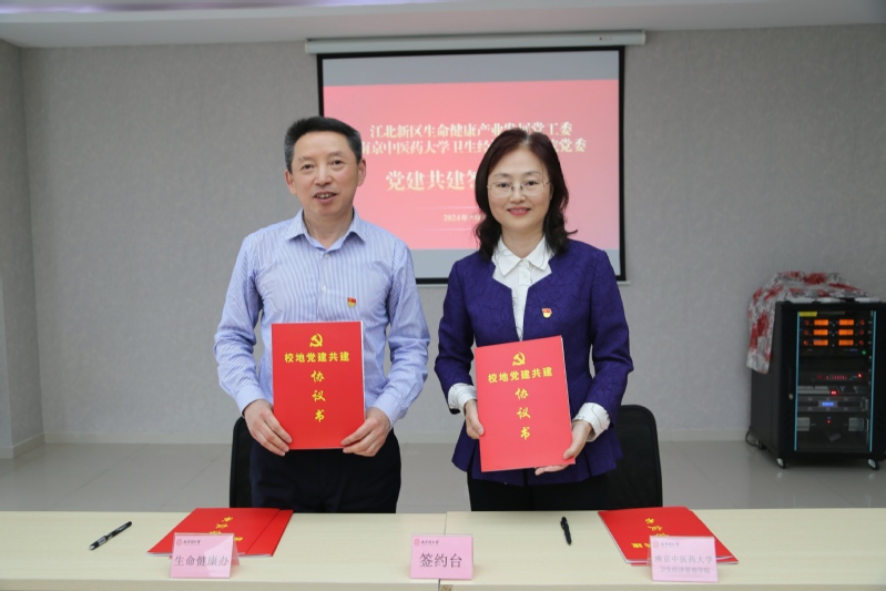 王红云首先带队考察生物医药谷及南京同仁堂、健友生化两家企业,深入了解园区及企业发展情况和人才需求。在交流探讨中,双方一致认为,在教、研、产、用协同发展上合作潜力巨大,要以党建共建激发教师、学生、企业等各类主体协同育人的积极性,依托南京中医药大学卫生经济管理学院这一党建阵地,充分发挥江北新区生命健康产业发展党工委在生命健康产业发展需求、就业实习岗位供给、党建对企业人才引领等方面的作用。在校政企三方共同见证下,学院党委与江北新区生命健康产业发展党工委进行了党建共建、团建共建签约仪式。