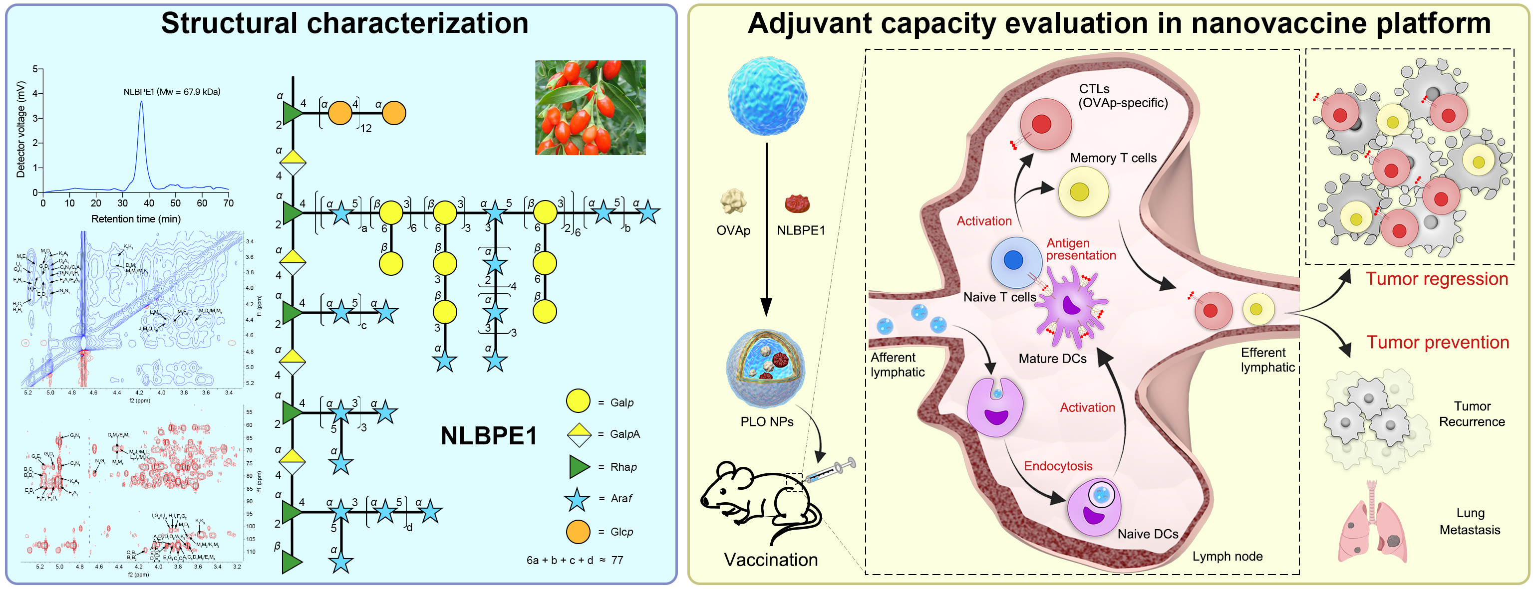 段金廒教授团队聚焦扶正类中药多糖结构与其免疫调节作用之间的构效关系,开展了提取纯化、结构解析和生物活性评价等基础研究工作(中草药 2025;中国中药杂志 2024)。前期研究发现,枸杞子多糖NLBP能够激活树突状细胞并上调抗原加工和迁移相关基因,提示其具备作为肿瘤疫苗候选佐剂的潜力(Int. J. Biol. Macro. 2024; Biomed. Pharmacother. 2024)。然而,中药多糖的天然异质性限制了其结构–功能关系的系统解析及理性设计。