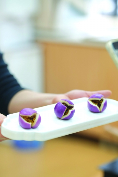 当天制作的玉兰花酥,在外形上参考了紫玉兰的形态,内馅则选用食用价值更高的白玉兰花蜜,并加入苹果丝,味道更加香甜。“花瓣需先用淡盐水浸泡去除涩味,再用蜂蜜与桂花酱渍上三天,方能入馅。加入苹果丝,是为了增加内馅的清甜层次,与玉兰花香相得益彰。”吴华介绍。