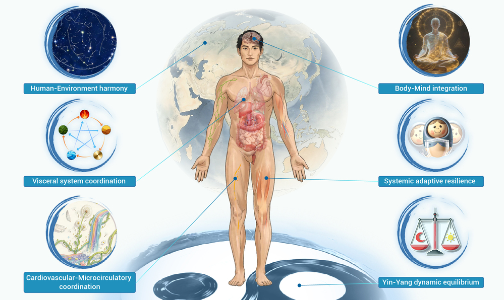 文章指出,传统生物医学以“无病”定义健康的模式面临局限,而中医数千年实践则将健康视为动态、和谐的“系统适应力状态”,这与现代医学向系统、功能转型的趋势高度契合。基于传统中医理论,团队提出了以下六大维度(图1):天人相应、阴阳匀平、形神合一、气血和调、脏腑协调、正气存内。