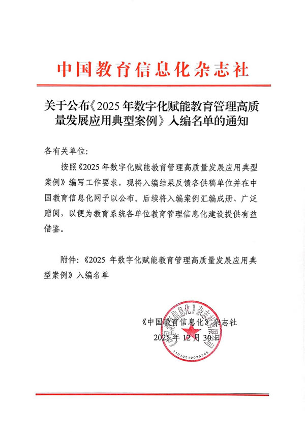 近日,中国教育信息化杂志社正式对外公布了《2025年数字化赋能教育管理高质量发展应用典型案例》的入编名单...
